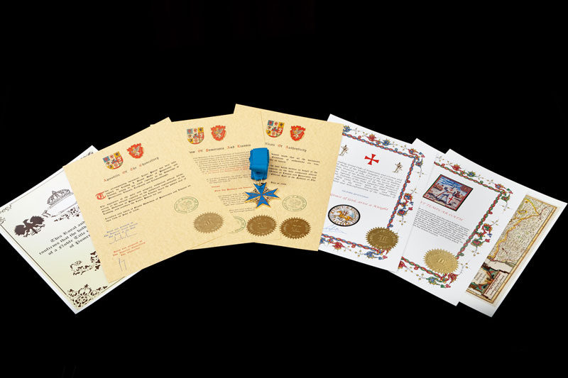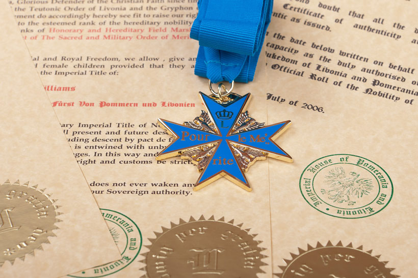 Our titles are effective, real and inheritable titles that come with a beautiful neck medal crafted in Gold and Blue Colors, with a Blue Ribbon. Ennoble yourself right now!